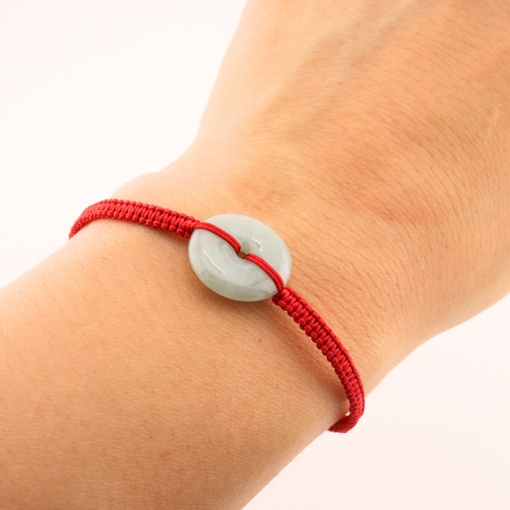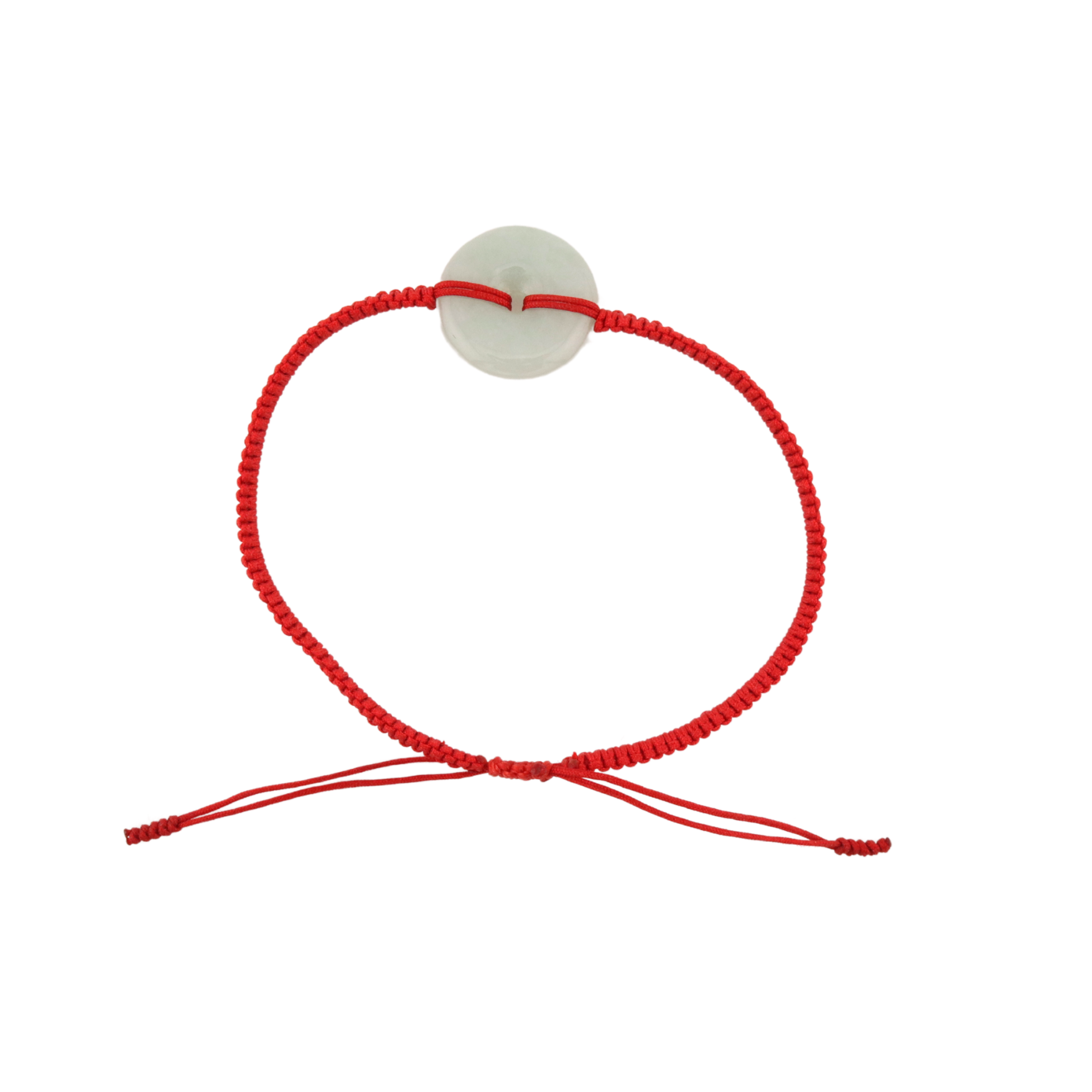 The Jade Donut Bracelet, crafted with vibrant red string, features the iconic Ping An Kou (平安扣), a symbol of peace, protection, and prosperity. The jade donut, inspired by ancient copper coins, represents harmony and wholeness, while red string enhances its Feng Shui energy, symbolizing luck, strength, and vitality.