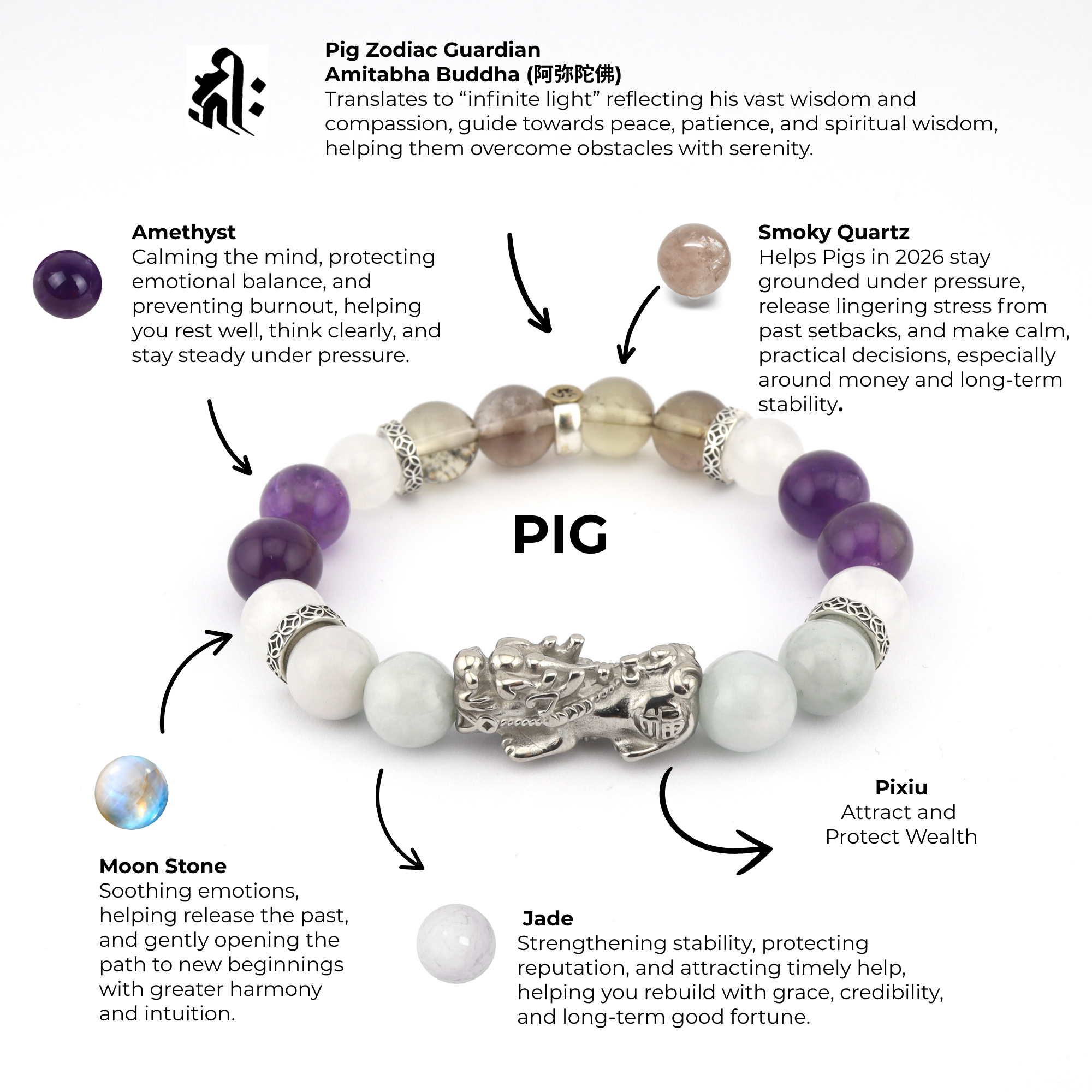 Created for Pigs in 2026, Graceful Abundance reflects a year of recovery, reputation rebuilding, and steady elevation after past upheavals. Guided by Amitabha Buddha, this bracelet supports emotional calm, moral clarity, and patience under pressure. As opportunities return through influential allies and renewed visibility, Graceful Abundance helps Pigs release past burdens, remain principled amid provocation, and move forward with grace rather than force, transforming stability into lasting prosperity.