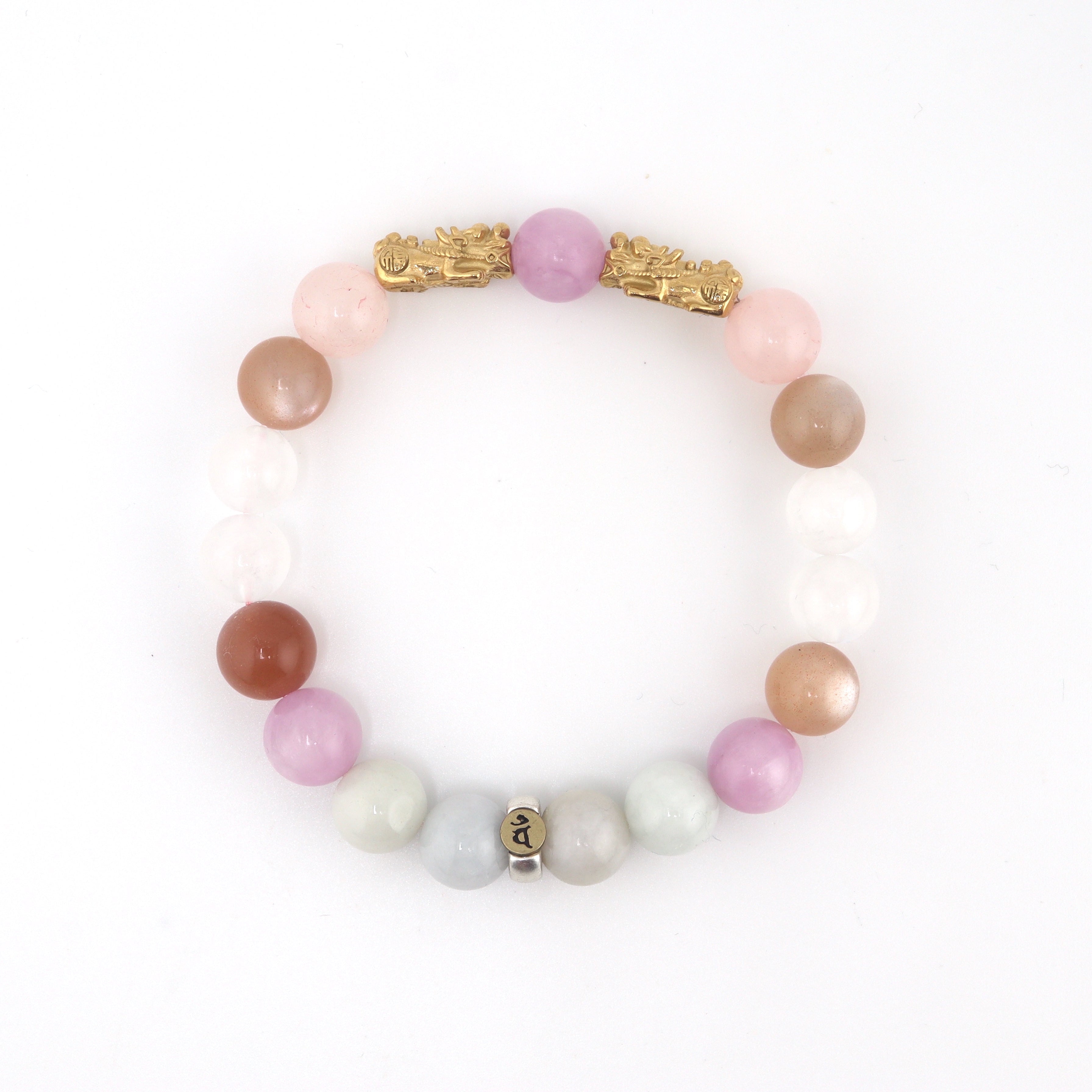 Created for Goats in 2026, this bracelet is designed to stabilise inner light during a year of heightened Fire energy and constant transition. Guided by Vairocana Buddha, it anchors clarity, emotional steadiness, and moral direction, helping Goats transform uncertainty into calm, steady progress. Through the harmonious balance of Jade, Moonstone, Sunstone, Kunzite, and Rose Quartz enhanced by Pixiu guardians this piece supports grounded wealth, resilient emotions, and harmonious relationships, allowing Goats to move forward with quiet confidence, balanced strength, and lasting prosperity.