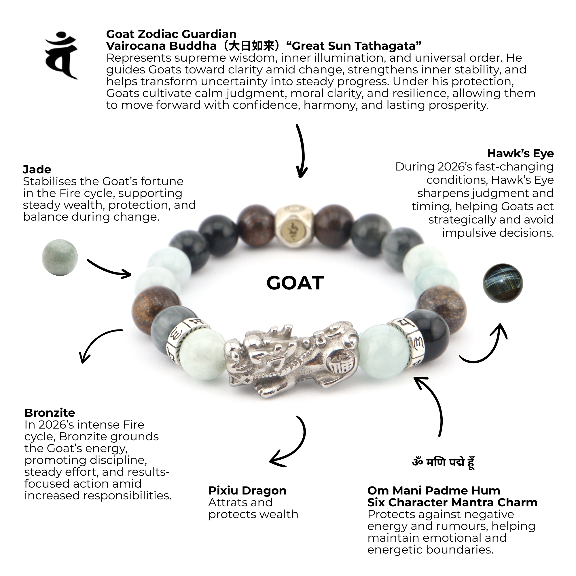 Created for Goats in 2026, this bracelet is designed to stabilise inner light during a year of heightened Fire energy and constant transition. Guided by Vairocana Buddha, it anchors clarity, emotional steadiness, and moral direction, helping Goats transform uncertainty into calm, steady progress. Through the harmonious balance of Jade, Moonstone, Sunstone, Kunzite, and Rose Quartz enhanced by Pixiu guardians this piece supports grounded wealth, resilient emotions, and harmonious relationships, allowing Goats to move forward with quiet confidence, balanced strength, and lasting prosperity.