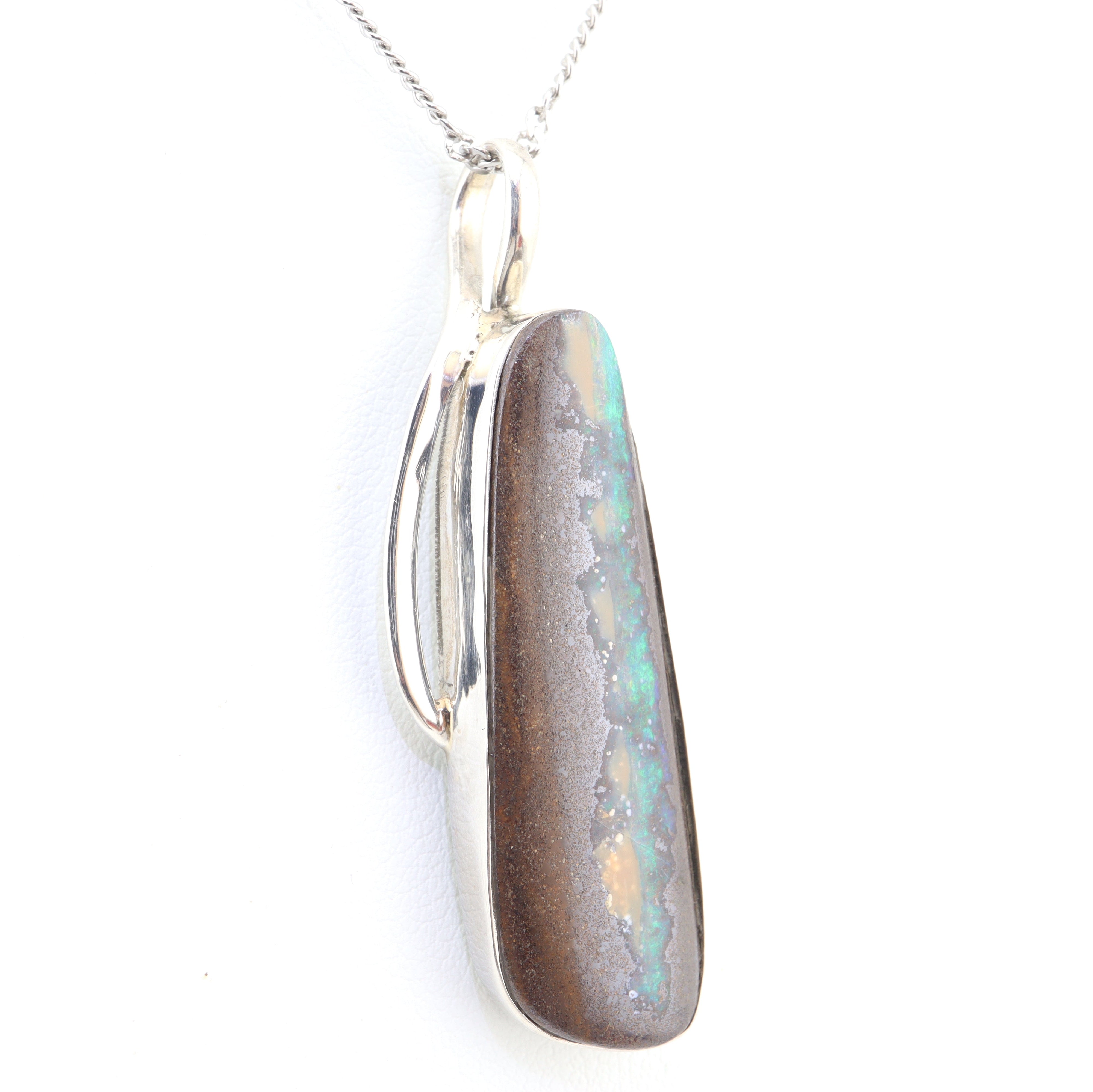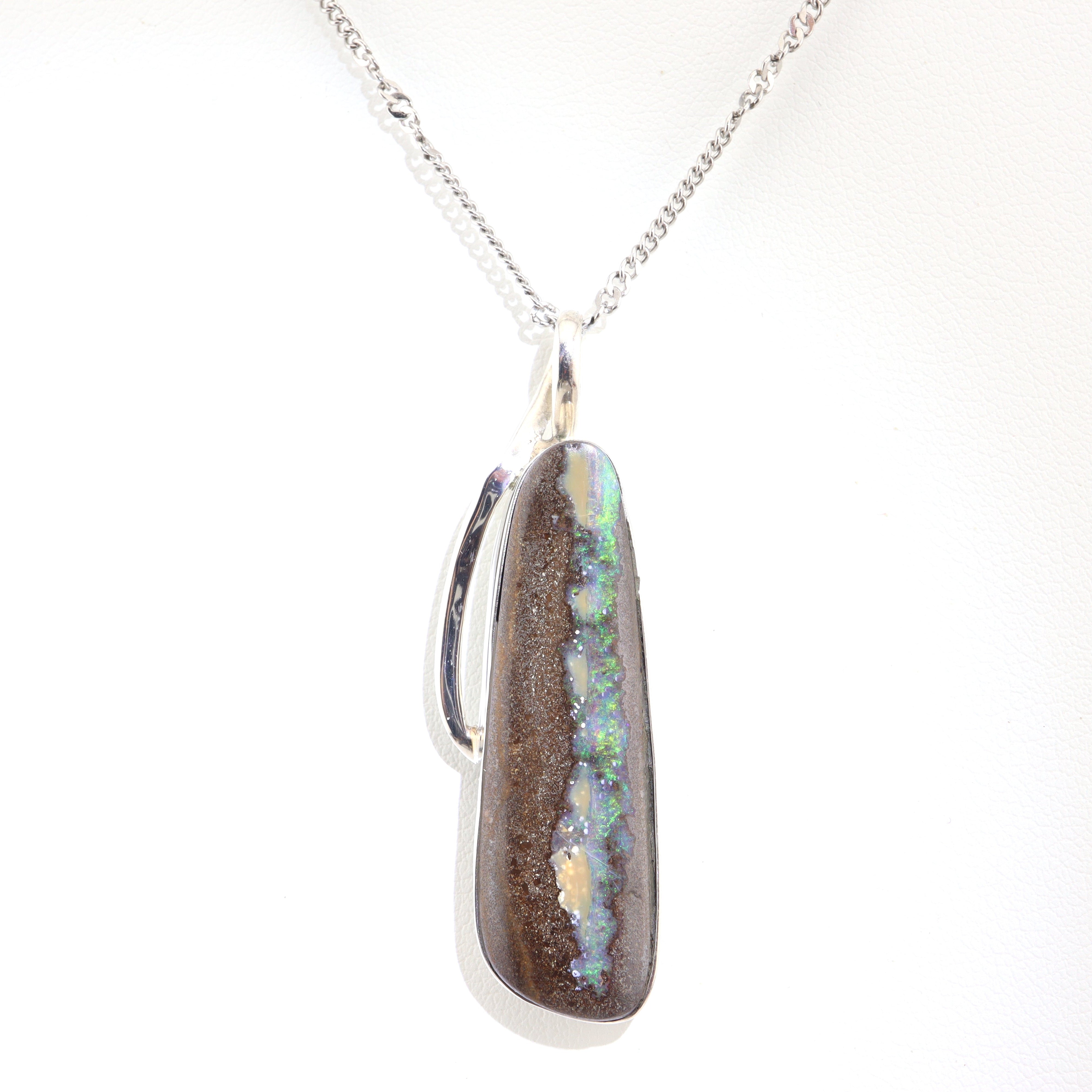 Featuring a solid cabochon-cut Boulder Opal from Lightning Ridge, this piece showcases organic colour patterns formed naturally within the stone. The softly curved polish allows light to travel across the opal’s surface, revealing its layered brilliance and earthy elegance. Set in 925 Sterling Silver and paired with a stainless steel chain, this necklace is designed for effortless everyday wear or meaningful gifting.