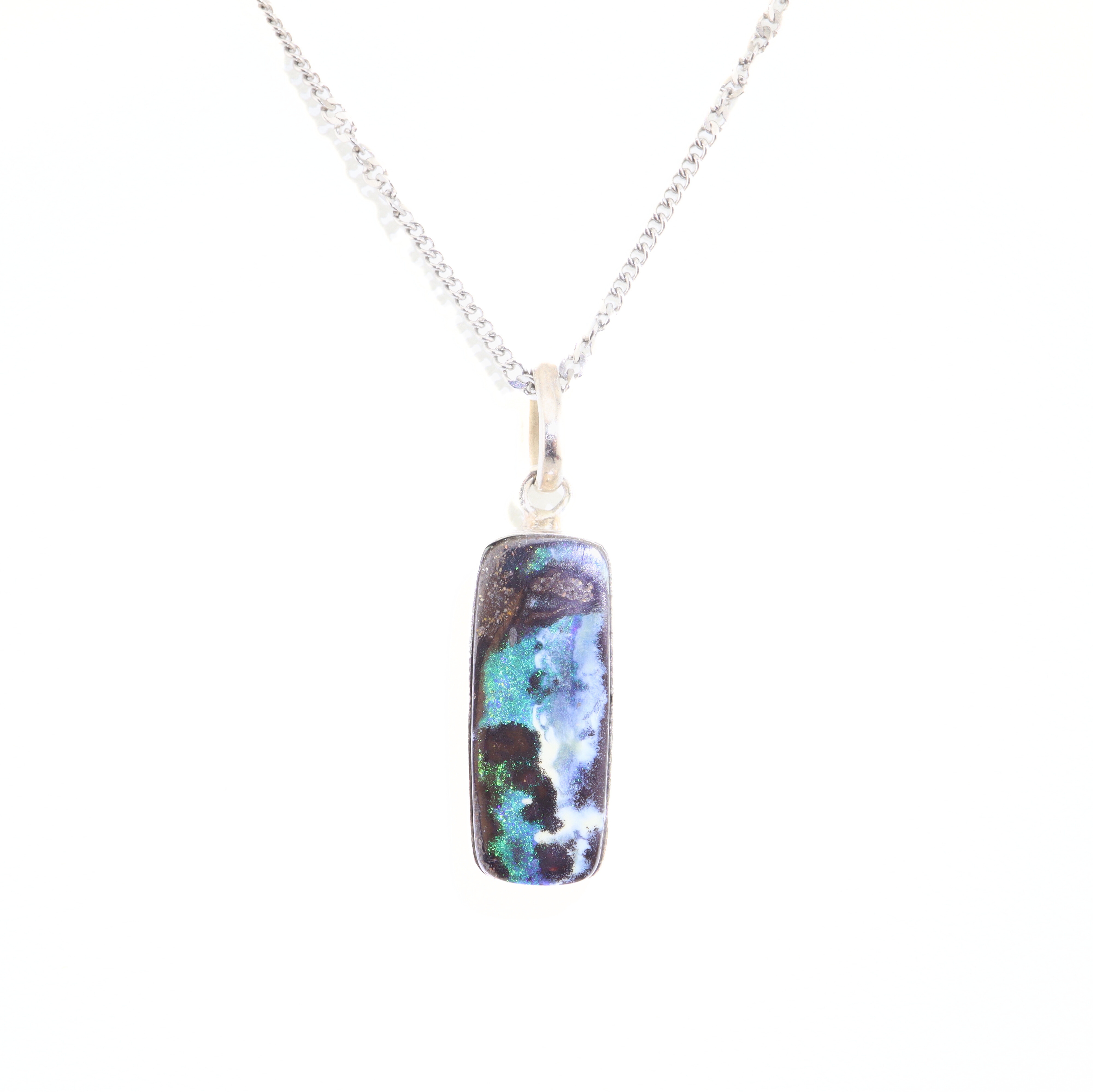 Featuring a solid cabochon-cut Boulder Opal from Lightning Ridge, this piece showcases organic colour patterns formed naturally within the stone. The softly curved polish allows light to travel across the opal’s surface, revealing its layered brilliance and earthy elegance. Set in 925 Sterling Silver and paired with a stainless steel chain, this necklace is designed for effortless everyday wear or meaningful gifting.