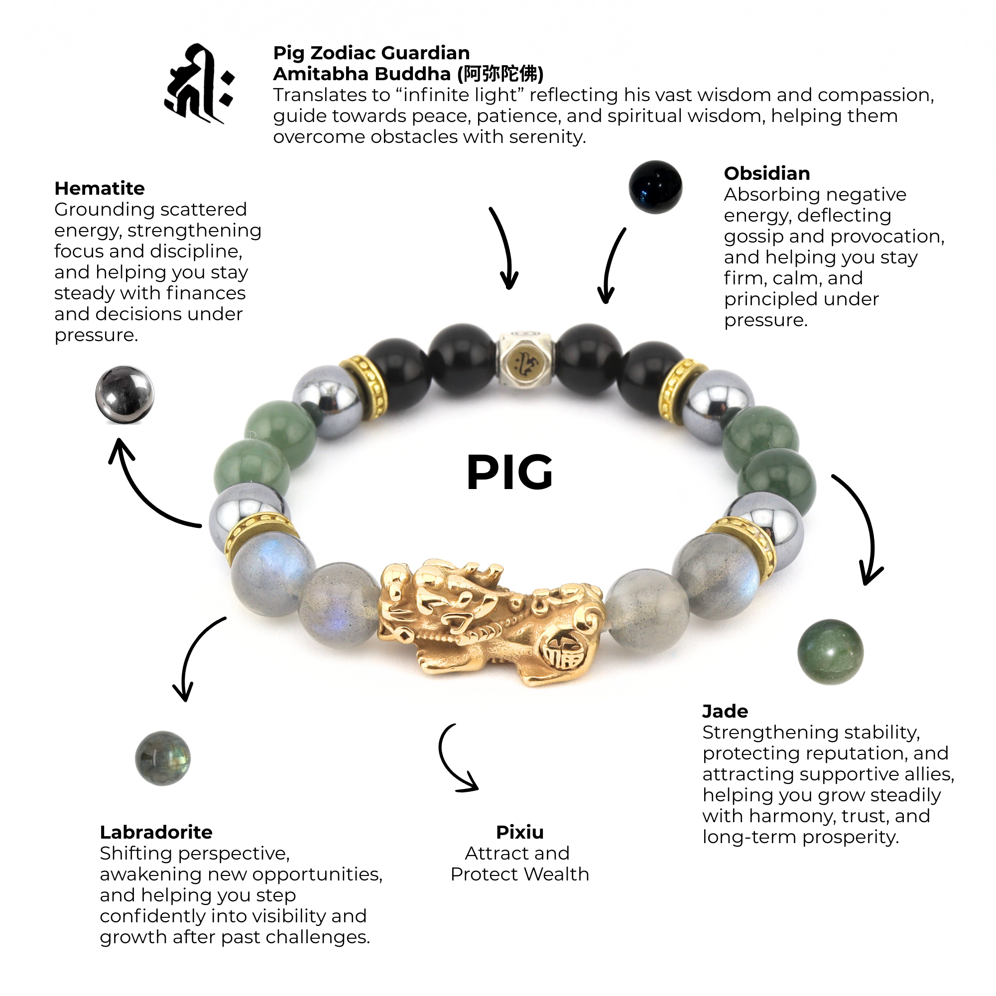 Created for Pigs in 2026, Steadfast Prosperity is designed for a year that demands strength, discipline, and calm resilience. While external pressures, provocation, and financial caution remain themes, this bracelet supports Pigs in standing firm, protecting their reputation, and advancing steadily without force. Guided by Amitabha Buddha, Steadfast Prosperity helps anchor scattered energy, deflect negativity, and transform challenges into grounded, long-term wealth and stability through patience and principled action.
